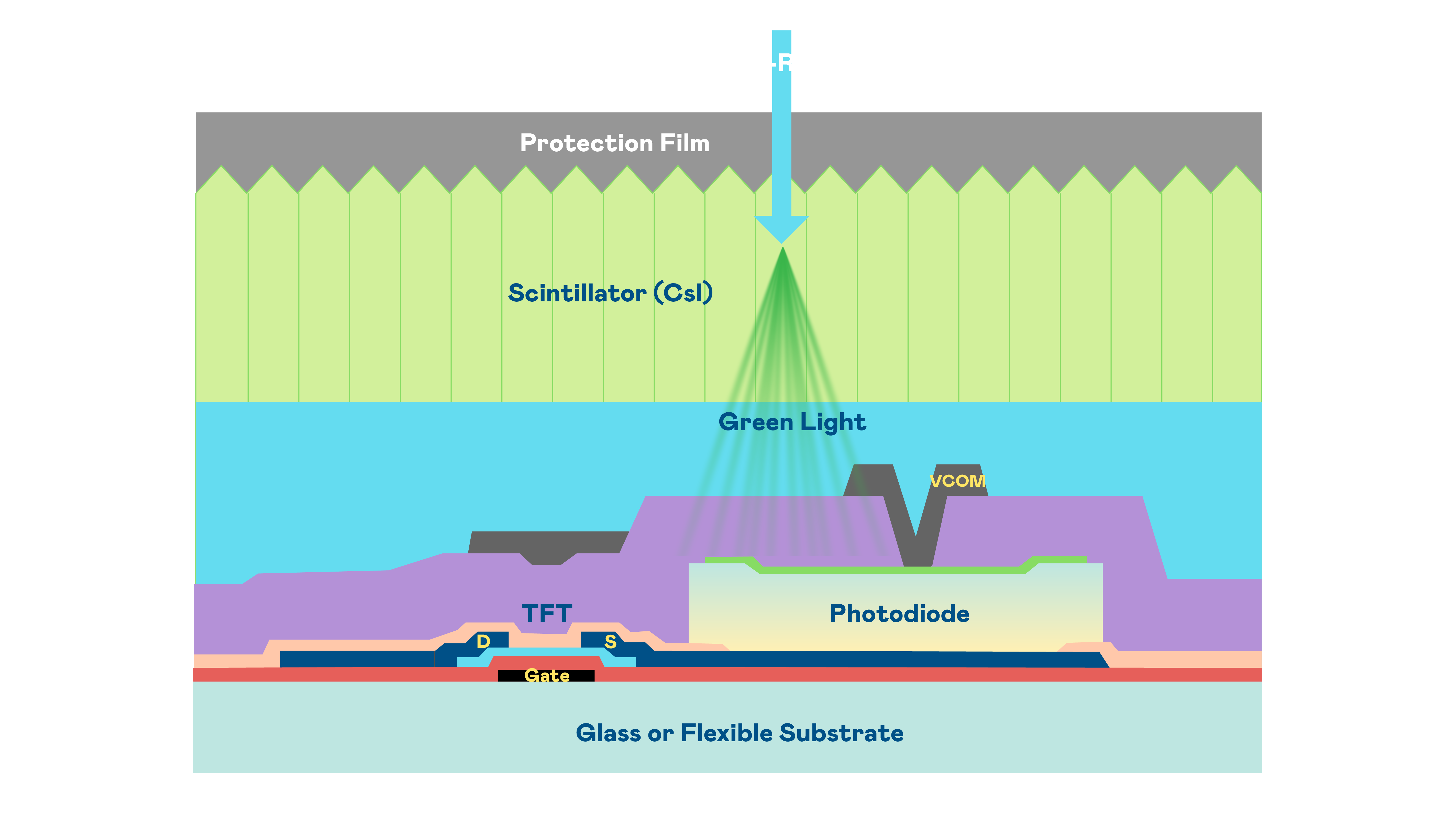 EVO视讯的X光影像感测阵列使用薄膜电晶体 (TFT) 作为每个像素的读取开关,搭配光电二极体(Photodiode)的光电转换元件,用以感测X光影像讯号。